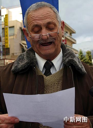 3月25日,北京2008年奧運圣火希臘傳遞第二天,慶典儀式在終點約阿尼納舉行。一位當地老者在朗誦自己新近創作的贊美奧運圣火的詩歌。 中新社記者 王歡