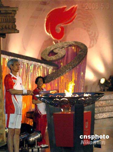 五月三日,最后一名火炬手、澳門立法會議員梁慶庭在漁人碼頭點燃北京奧運圣火盆,澳門奧運火炬接力圓滿結束。中新社發 史利 攝