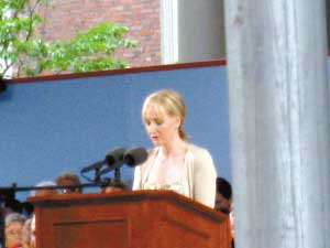 6月5日14時(shí)30分,繼上午的學(xué)位頒發(fā)儀式結(jié)束之后,哈佛大學(xué)的畢業(yè)慶典儀式繼續(xù)進(jìn)行,而其中的重頭戲就是《哈利·波特》作者J·K·羅琳的演講。盡管下著毛毛細(xì)雨,擺了兩萬多把椅子的哈佛園(Havard Yard,哈佛主校區(qū))仍然座無虛席。參加慶典的學(xué)生親友中,不乏表情雀躍的小朋友。身穿淺色花裙、外著米色外套、手握紅色坤包的羅琳甫一出現(xiàn),全場(chǎng)便一陣騷動(dòng),并響起了長(zhǎng)時(shí)間的掌聲。