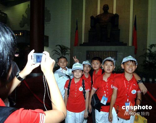 福建小營員前往臺北孫中山紀念館參觀并在孫中山塑像前留影。中新社發 劉可耕 攝