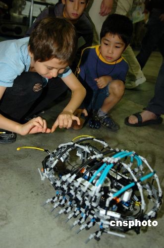圖為孩子們在和機器蟲子進行交流。中新社發 朱沿華 攝