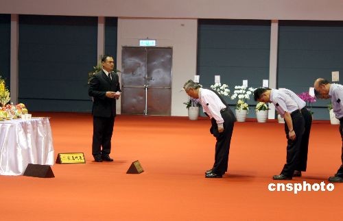 臺塑企業創辦人王永慶的遺體十七日由長榮班機運抵臺灣,靈堂設在桃園縣的長庚大學活動中心。圖為王永慶身邊的工作人員在靈堂內祭拜。中新社發 耿軍 攝