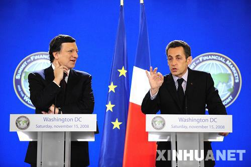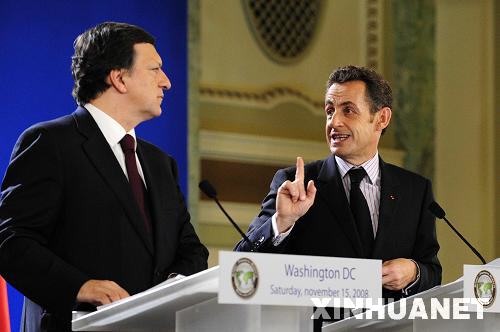 11月15日,在美國首都華盛頓出席二十國集團(tuán)領(lǐng)導(dǎo)人金融市場和世界經(jīng)濟(jì)峰會的法國總統(tǒng)薩科齊(右)和歐盟委員會主席巴羅佐聯(lián)合舉行新聞發(fā)布會。 新華社記者張巖攝