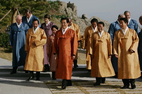 資料圖片:2005年11月19日,國家主席胡錦濤出席亞太經合組織第十三次領導人非正式會議。圖為胡錦濤主席等亞太經合組織成員的領導人身著韓國民族特色的服裝“圖魯馬吉”合影后,前往出席《亞太經濟合作組織第十三次領導人非正式會議釜山宣言》的宣讀儀式。樊如鈞 攝