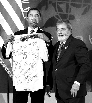 美國總統貝拉克·奧巴馬9日和巴西總統盧拉·達席爾瓦會面時,雙方大談足球經,盧拉還送給奧巴馬一件巴西國家男子足球隊成員簽名的球衣。