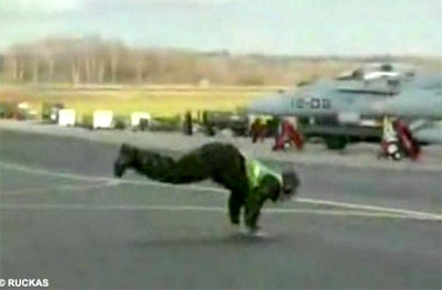 英皇家空軍軍官跑道上邊跳霹靂舞邊指揮飛機(jī)起飛
