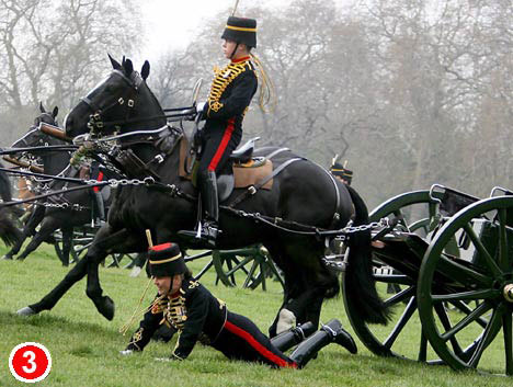 21日當天,英國皇家騎兵團的成員攜禮炮向海德公園進發,一路上不少民眾擠在道路兩旁觀看。忽然一名年輕的女炮手跌身下馬,眾目睽睽之下,她慌忙環視四周并立即翻身上馬,以保證隊列安全行進。英國《每日郵報》的記者眼疾手快,將女炮手摔下馬的情景搶拍了下來。(梁陳聰)