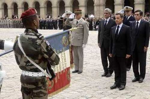 法國總統(tǒng)薩科齊、總理菲永和政府內閣部長以及部分議會議員出席了儀式。國葬儀式后,參加儀式的人員在榮軍院的圣路易教堂舉行了宗教追悼儀式,薩科齊在儀式上致悼詞,贊揚了10名陣亡法國戰(zhàn)士的功績。