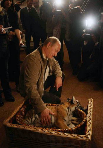 普京溫柔地?fù)崦䱷|北虎幼崽