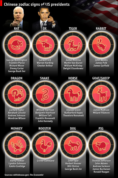 按照中國的12生肖,麥凱恩是屬鼠的。而在他之前有5位屬鼠的候選人最后當選總統(tǒng),包括:喬治·華盛頓和吉米·卡特。另外,屬豬和蛇的前總統(tǒng)也達到5位。然而,屬牛的奧巴馬似乎遇到了不好的兆頭,在他之前,只有3位屬牛的候選人最終問鼎。(弗萊)