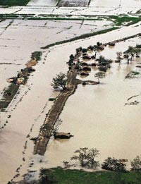 仰光機場附近的村落被洪水淹沒,僅剩數間房屋的屋頂在水面。