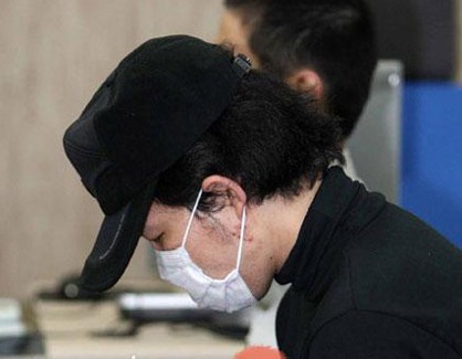 犯罪嫌疑人鄭祥鎮戴著帽子和口罩在首爾江南警察署接受調查。