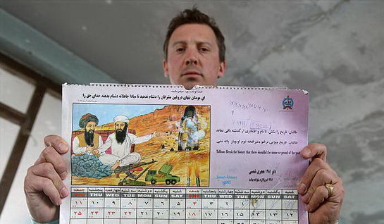 據英國《太陽報》報道,英國皇家海軍陸戰隊第42突擊大隊近日在一次機降突襲行動中,摧毀塔利班在阿富汗赫爾曼德省最重要據,繳獲了一本2003年塔利班印制的月歷,這本月歷以拉登和塔利班最高頭目奧馬爾為封面人物。