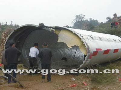 昨日,記者在主體殘骸墜落地現(xiàn)場看到:一個像中巴車般大小的圓柱體橫躺在已收割的包谷地里,由于殘骸墜落時巨大的沖擊力,圓柱體已略變橢圓,但仍較為完整,一個鐵架子的幾支腳已鉆進了泥土里,還有一個像大塑料長管子的物件墜落在一姓吳的農家房屋中堂,并將該堂屋擊壞。
