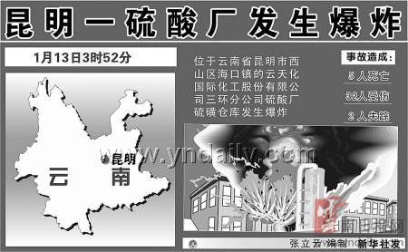 昨日凌晨3時(shí)50分許,昆明市西山區(qū)?阪(zhèn)云天化國(guó)際化工股份有限公司三環(huán)分公司硫酸廠硫磺倉庫,在硫磺裝卸過程中,硫磺粉塵發(fā)生爆炸并起火燃燒。事故共造成5人死亡,32人受傷,兩人失蹤。