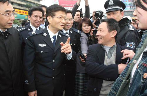下午2點30分,孟建柱和隨行的公安部黨委委員、部長助理鄭少東一行來到廣州火車站廣場。一下車,孟建柱就走進(jìn)正在廣場候車的人群當(dāng)中,向幾位分別返回湖北襄樊、四川廣安的務(wù)工人員詳細(xì)了解出行情況:乘車到哪里?車票買到?jīng)]有?候車是否安全?正在排隊候車的旅客聽說公安部部長來了,紛紛走過來和部長握手,他們激動地說:“看到您在這兒,我們感到很安全,心也放下了。”