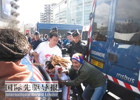 本報(bào)記者親眼看到,一個(gè)“藏獨(dú)”分子突然跳進(jìn)安全防護(hù)欄,旁邊的法國(guó)警察眼疾手快,迅速把他按倒在地,然后扔出了安全防護(hù)欄。即使遇到一些政客出來挑事,警察也同樣不會(huì)客氣。據(jù)英國(guó)《衛(wèi)報(bào)》記者記述,一個(gè)巴黎市綠黨議員在火炬接力開始時(shí)突然表示抗議,很快被警察請(qǐng)了出去。
