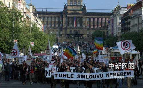 捷克首都布拉格5月5日再次爆發(fā)反對美國在捷克設(shè)立反導(dǎo)雷達(dá)基地的游行示威。大約1500名示威者展示“這個協(xié)定我們不接受”等標(biāo)語從瓦茨拉夫廣場出發(fā)穿越市中心,舉行反對美國在捷克設(shè)立反導(dǎo)雷達(dá)基地的游行。(黃頻 攝)
