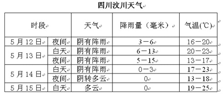 其他受到汶川地震波及的地區(qū),重慶13日20時(shí)至15日20時(shí),將有陣雨或雷陣雨,雨量以小到中雨為主。