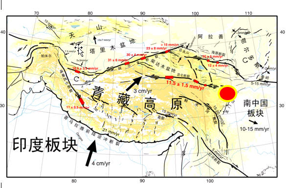 印度板塊向亞洲板塊俯沖,造成青藏高原快速隆升。高原物質(zhì)向東緩慢流動,在高原東緣沿龍門山構(gòu)造帶向東擠壓,遇到四川盆地之下剛性地塊的頑強阻擋,造成構(gòu)造應(yīng)力能量的長期積累,最終在龍門山北川-映秀地區(qū)突然釋放。