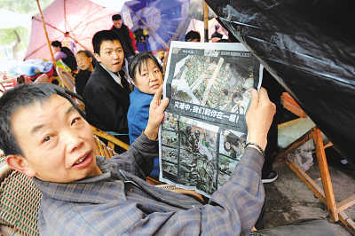 綿陽(yáng)安縣人民公園安置點(diǎn),為災(zāi)區(qū)群眾提供了最新的報(bào)紙。(王科/攝)