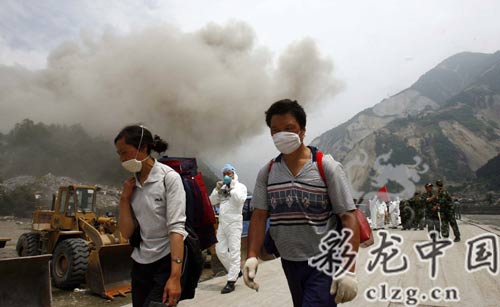 居民離開映秀鎮,背后升起爆破拆除房屋而產生的濃煙。記者 韓億國攝 (來源:彩龍中國)