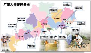 前日晚上8時至昨日下午3時,河源市區以及周邊的東源縣、紫金縣部分鄉鎮持續普降大雨和暴雨,持續降雨已造成河源市區及周邊鄉鎮發生洪澇災害,城鄉路段積澇嚴重。該市兩大江河——東江和新豐江的河水均有上漲,但仍在警戒線下安全運行,尚未出現險情。
