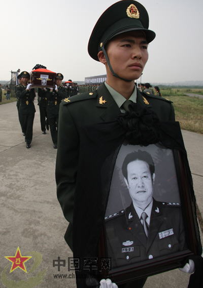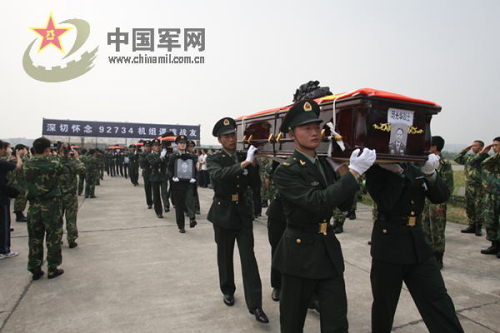 在低回的哀樂聲中,汽車緩緩駛入跑道。兩側的官兵肅立,注目迎候。靈車停穩后,哀樂停,禮兵就位。抬靈禮兵分頭進車起靈,靈柩上肩,迎靈、敬禮!靈柩緩步移向靈位,全體人員行注目禮。靈柩在靈位停穩后,禮畢,靈柩落下,全場向烈士默哀。3分鐘后,默哀畢,起靈,全體列隊,行舉手禮,目送靈車緩緩離開!∮浾咧艹瘶s攝影報道