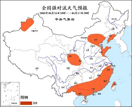 中新網6月16日電 問天網消息,中央氣象臺今天下午六點鐘繼續發布暴雨預報和強對流天氣預報。
