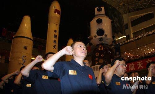 中國(guó)運(yùn)載火箭技術(shù)研究院二百多名“神箭”發(fā)射試驗(yàn)隊(duì)隊(duì)員列隊(duì)面向國(guó)旗宣誓,“長(zhǎng)征二號(hào)F”運(yùn)載火箭總設(shè)計(jì)師荊木春代表發(fā)射試驗(yàn)隊(duì)表示,有信心、有決心確保“神七”運(yùn)載火箭發(fā)射圓滿成功。隨后,發(fā)射試驗(yàn)隊(duì)隊(duì)員們都拿出寫(xiě)好的“承諾卡”,依次上前粘貼于一塊專門(mén)的展板上,莊嚴(yán)承諾“確保成功,確保安全”。