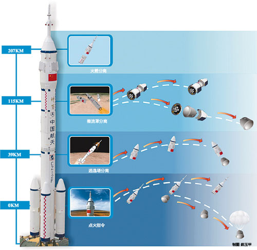 從火箭發射前30分鐘到起飛后120秒、飛行高度在39千米時逃逸塔分離,以及從120秒到200秒左右、飛行高度115千米時整流罩分離這兩個時間空間段內,萬一發生意外緊急狀況時,逃逸塔就會啟動,靠固體燃料火箭發動機提供巨大的瞬間推力,將航天員所在的飛船從火箭上拉出來,帶著航天員偏離火箭的運行軌道,逃離險境,然后借助降落傘和緩沖裝置安全降落到地面。由于增加了逃逸系統,長征二號F火箭的安全性指標由過去發射100次可能出現3次危及航天員生命的問題,減少到現在發射1000次才可能發生3次這樣的事故,達到了國際先進水平。