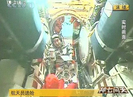 中新網9月25日電 25日18時25分許,神舟七號三名航天員陸續進艙。第一名進艙的是景海鵬,第二名進艙的是劉伯明,最后,指令長翟志剛也開始進入。