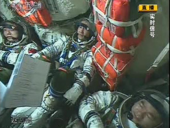 身穿乳白色航天服,仰坐在艙內的三名航天員,在“神七”發射后,一直處于輕松自信的狀態。這點在他們面帶笑容的臉上,以及時不時拿起身邊的指令小冊子閱讀就可窺見。