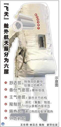 中國的艙外航天服通體純白,從上到下依次是頭盔、上肢、軀干、下肢、壓力手套、靴子。從內到外,則分為6層:由特殊防靜電處理過的棉布織成的舒適層、橡膠質地的備份氣密層、復合關節結構組成的主氣密層、滌綸面料的限制層、通過熱反射來實現隔熱的隔熱層、最外面的外防護層。服裝的四肢裝有調節帶,通過調節上臂、小臂和下肢的長度,身高1.60米—1.80米的人都能穿上這套衣服。