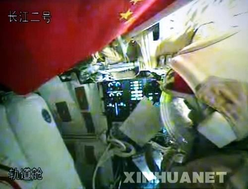 在長達十幾小時的準備工作之后,神舟七號航天員翟志剛穿著“飛天”艙外航天服,于26日23時36分第1次在茫茫太空中的神七軌道艙內亮相。