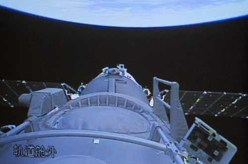 圖為26日晚北京飛控中心指揮大廳顯示屏上神舟七號艙外的畫面。