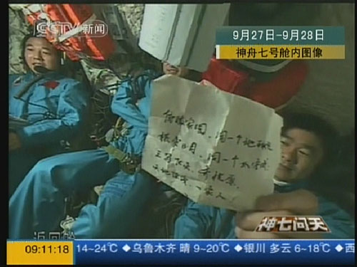 電視畫(huà)面顯示,三位航天員面帶微笑,表情輕松愉悅,劉伯明還向鏡頭展示了一張字條。