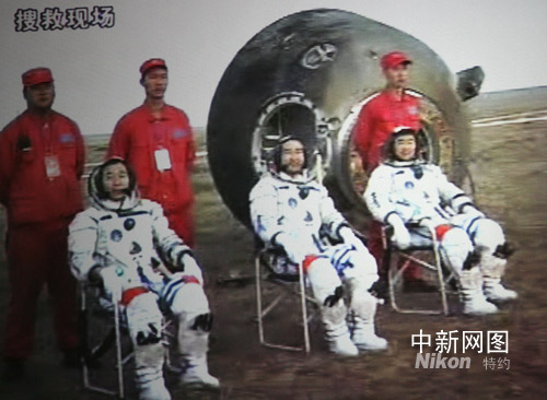 航天員翟志剛、劉伯明和景海鵬安全出艙,中國神舟七號載人航天飛行獲得圓滿成功(攝于北京航天飛控中心大屏幕)。中新社記者 齊彬 攝