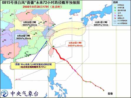 預計,未來數(shù)小時“薔薇”將在臺灣北部回旋少動,以后將以每小時15公里左右的速度向西北方向移動,今天夜間進入臺灣海峽北部海面。之后,將轉(zhuǎn)向偏北方向移動,強度逐漸減弱,將于明天白天登陸或擦過福建北部到浙江南部一帶沿海,也有可能在閩浙近海轉(zhuǎn)向東北方向移動。