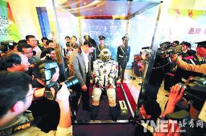 胸前貼有“翟志剛”姓名牌,左臂上一面鮮艷的五星紅旗,上月底從太空歸來的百萬造價航天服,昨天下午在重裝警備人員的護(hù)衛(wèi)下安全抵達(dá)大紅門,記者了解到,作為2008北京大紅門國際服裝節(jié)的重要展品,這件寶貝今起至20日將與市民、觀眾“親密接觸”。