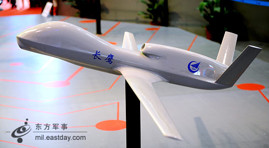 在“暗劍”旁邊的是“長鷹”無人機(jī),有著和美軍“全球鷹”無人機(jī)類似響亮的名字,外形同樣類似“全球鷹”。“長鷹”做為專用無人戰(zhàn)略偵察機(jī),具有大范圍的持久監(jiān)視、偵察和情報收集功能,為C4KISR任務(wù)系統(tǒng)重要組成部分,看來連作用都與“全球鷹”全面接軌了。
