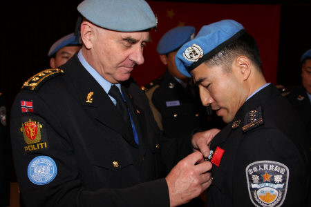 中新網11月18日電 11月16日,中國第五批駐科索沃維和警察榮獲聯合國維和勛章的授勛儀式在科首府普里什蒂納舉行。聯合國駐科索沃特派團代理總警監伊弗·弗里加德(左)在普里什蒂納給中國維和警隊隊長吳勝國佩戴聯合國維和勛章。