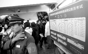據了解,今年的公務員考試中,北京地區考生9.5萬人,比去年增加了1.5萬人,北京今年共在全市設立了132個考點、3186個考場。今年,國家公務員考試考錄比例為57比1,較之去年46比1的考錄比例競爭更加激烈,不少參加考試的考生戲稱自己是“炮灰”。