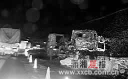 昨晚9時(shí)50分,記者乘坐的采訪車(chē)終于抵達(dá)車(chē)禍現(xiàn)場(chǎng)。交警用警示標(biāo)志攔出一段約200米遠(yuǎn)的警示帶,只留下一個(gè)車(chē)道供車(chē)輛通行。不遠(yuǎn)處,3臺(tái)被燒壞的貨車(chē)擺在公路一側(cè),一臺(tái)貨車(chē)上的棉布已經(jīng)燒毀,3臺(tái)車(chē)嚴(yán)重受損。現(xiàn)場(chǎng)有兩名交警維持秩序,其他受損車(chē)輛和死傷病員已轉(zhuǎn)離現(xiàn)場(chǎng)。
