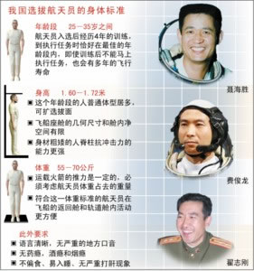 航天專家介紹,此類航天員選拔主要針對我國載人航天戰(zhàn)略第三步,為建造長期有人照料的發(fā)射空間站做選拔,最早或于2015年前飛天。與第一批航天員選拔標(biāo)準(zhǔn)相比,此次選拔將更側(cè)重對文化知識水平的考查,同時極有可能出現(xiàn)女航天員的身影。在不遠的將來,我國航天員中也將出現(xiàn)科學(xué)家的面孔。