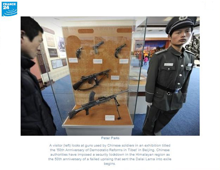 在北京舉辦的西藏民主改革50周年大型展覽中,展覽主辦者選取了幾件解放軍在1959年平息西藏武裝叛亂時繳獲的叛亂分子使用的美制和英制武器。可眼光敏銳的網友卻發現,法新社記者在3月6日的圖片報道中卻將這些武器說成是“中國軍隊使用的武器”。