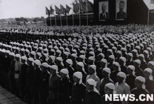 游行隊(duì)伍的前導(dǎo)是少年先鋒隊(duì)隊(duì)員,隊(duì)伍里有堅(jiān)決要拿下一千零七十萬(wàn)噸鋼的鋼鐵工人;還有機(jī)械工人、紡織工人、郊區(qū)已經(jīng)公社化的農(nóng)民、各機(jī)關(guān)的干部、大中學(xué)校的學(xué)生的隊(duì)伍,還有手工業(yè)合作社的社員、工商業(yè)者、市民和宗教界的隊(duì)伍。