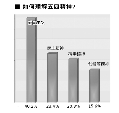 在對于五四精神的理解上,40.2%的受訪者選擇了“愛國主義”,認為這是五四精神中首先需要傳承的精神遺產,23.4%選擇“民主精神”,20.8%選擇“科學精神”,15.6%選擇“創新等其他精神”。調查顯示,國家、民族在大學生心中占據神圣的地位,75.4%的受訪者表示自己“為作為中國公民感到自豪”。