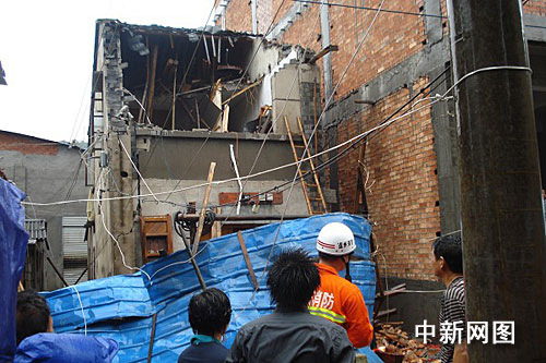 該房屋的二樓坍塌最為嚴(yán)重,房頂?shù)耐咂舅,瓦片、磚塊,泥石、水泥板堆滿了整個屋子,還有部分未完全倒塌的磚塊、梁柱仍在搖搖欲墜,現(xiàn)場一片混亂雜章。當(dāng)時,正下著大暴雨,極有可能發(fā)生二次坍塌。為了控制險情,消防官兵架起梯子,爬上屋頂,迅速拆除另一半未坍塌的屋頂瓦片。