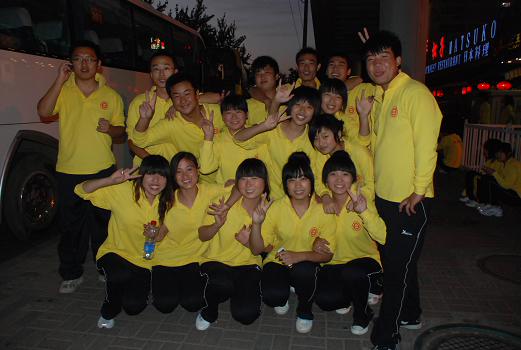 一陣快樂的笑聲引起了記者的注意,原來是一群年輕人在相互用手機拍照留念。他們是來自北京市汽車工業(yè)高級技術(shù)學(xué)校的25名學(xué)生。參加大型活動對他們來說一點都不陌生,因為他們經(jīng)歷過今年8月8日在“鳥巢”及奧林匹克景觀大道舉行的“三萬人演太極破世界紀錄”的活動。“8月8日的活動結(jié)束后,我們就開始準備國慶舞蹈了。大家用了3、4天就學(xué)會了。”不過接下來,同學(xué)們放棄暑假,用了整整一個月來精益求精。這些90后、80后的大孩子們開朗熱情,對于第一次實地演練檢驗一個多月來的努力成果顯得信心十足興奮不已,他們說,雖然在室外頂著日頭訓(xùn)練時挺辛苦,但是大家都覺得“特別自豪,特別快樂”,因為“我們能代表北京、代表中國向全世界展示我們國家的繁榮昌盛,這是非常難得的經(jīng)歷”。(記者 劉莉)